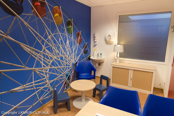 Ici comme ailleurs, l’objectif partagé est le même, repenser les structures d’accueil et les rénover de façon à procurer aux soignés comme aux soignants un environnement sécurisé et apaisant. Au CRCM de Dunkerque, 70 patients, enfants et adultes, sont suivis par une équipe composée d’une quinzaine de personnes. Médecins, infirmières, kinésithérapeuthe, psychologue, assistante sociale ou encore éducateur sportif se concertent en permanence, et les locaux rénovés avec notre concours reflètent parfaitement leur conception de la prise en charge optimale. D’abord un espace d’attente, égayé par un puits de lumière artificielle sous forme de ciel azur zébré de nuages de chaleur, puis un parcours de bureaux et salles communicantes, pour assurer la continuité du temps de suivi et faire en sorte que les patients ne se croisent plus : d’abord l’infimière pour un point général, puis l’espace « kiné », la salle d’éducation thérapeutique, la consultation du médecin, et enfin la psychologue.