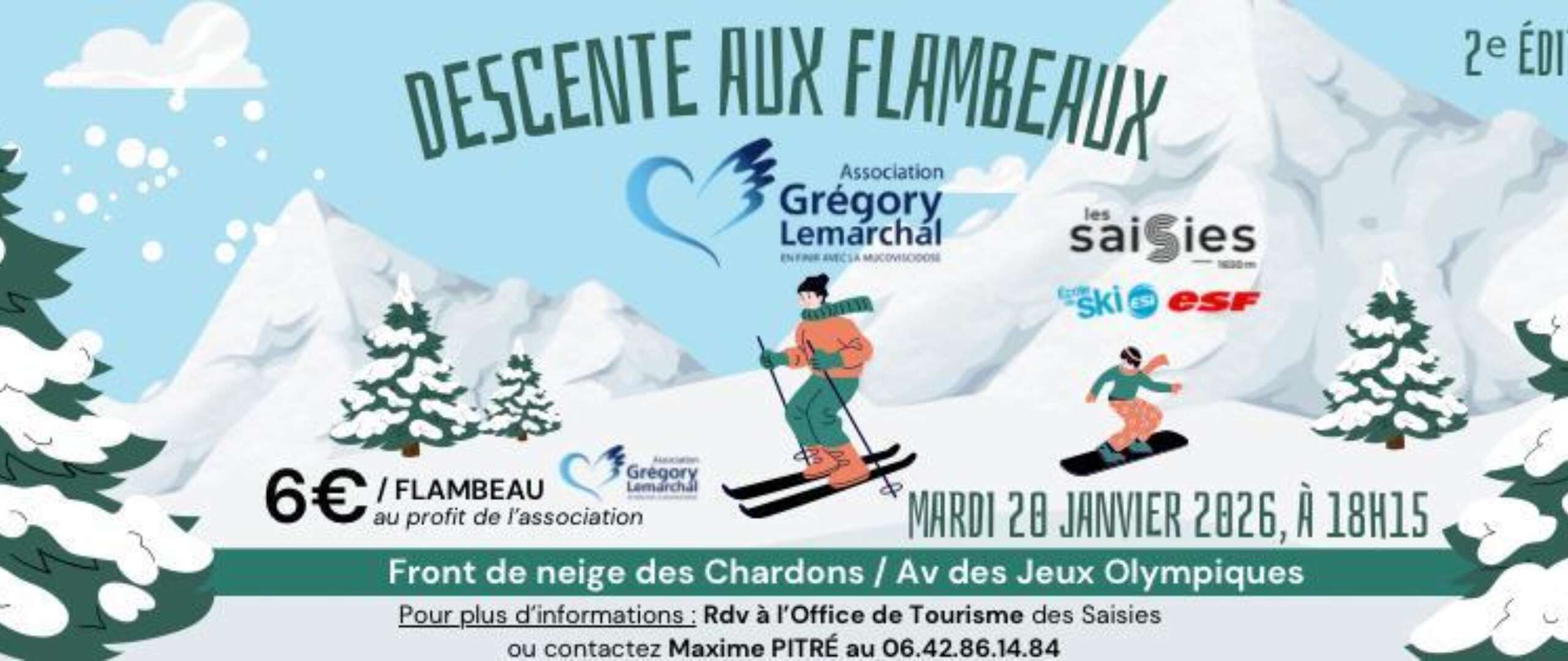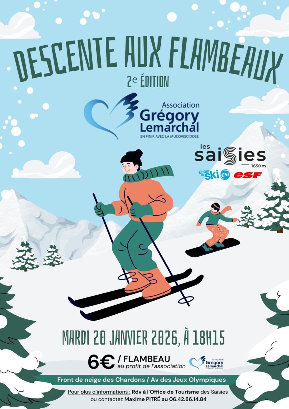 La magie de la montagne, la chaleur des flambeaux, et un élan de solidarité qui illumine la neige… La 2ᵉ édition de la Descente aux flambeaux au profit de l’Association Grégory Lemarchal revient aux Saisies le mardi 20 janvier 2026 à 18h15 !