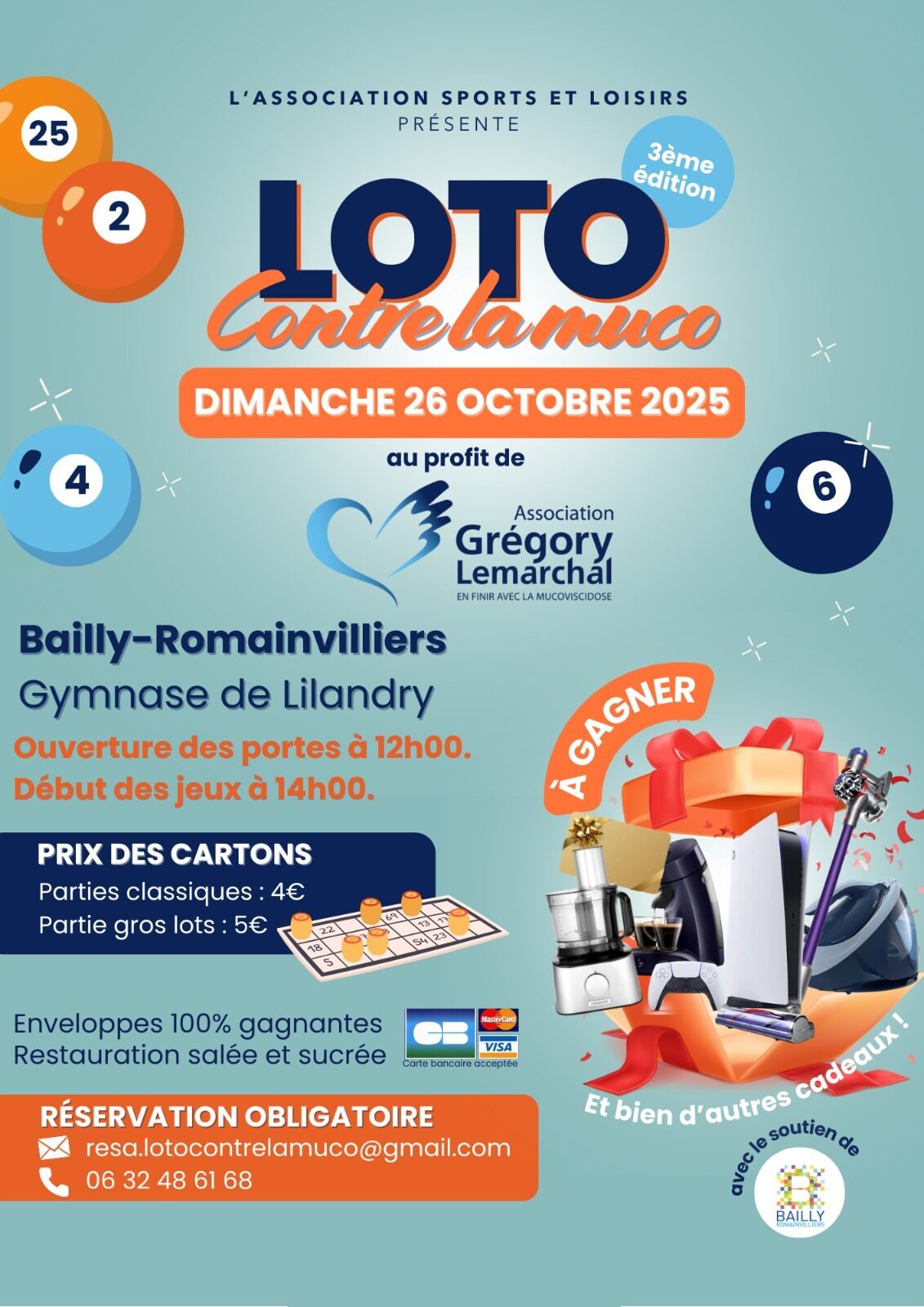 Le dimanche 26 octobre, ne manquez pas cette nouvelle édition du Loto contre la Muco, organisée par l’Association Sports et Loisirs. Ce loto se tiendra au gymnase de Lilandry à Bailly-Romainvilliers, avec l’ouverture des portes à 12h30 et le début des jeux à 14h.